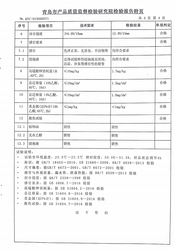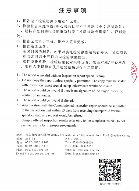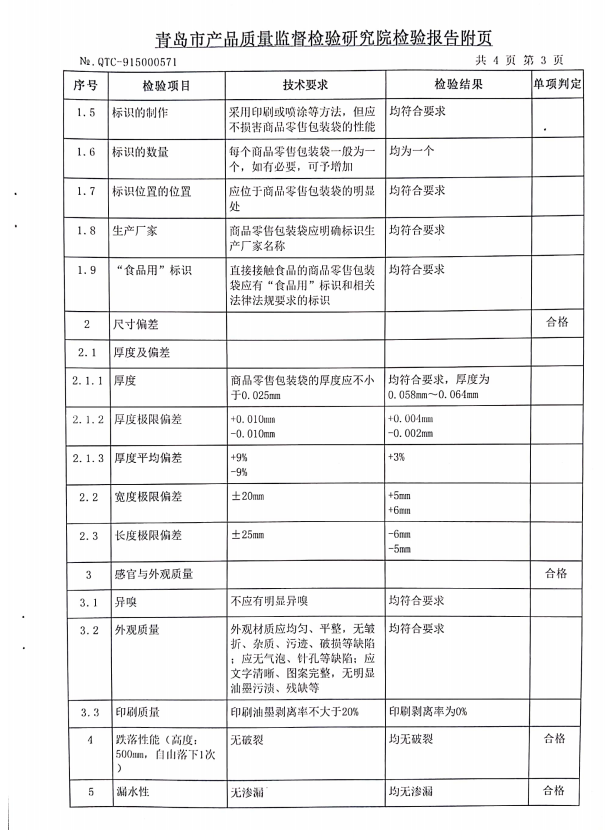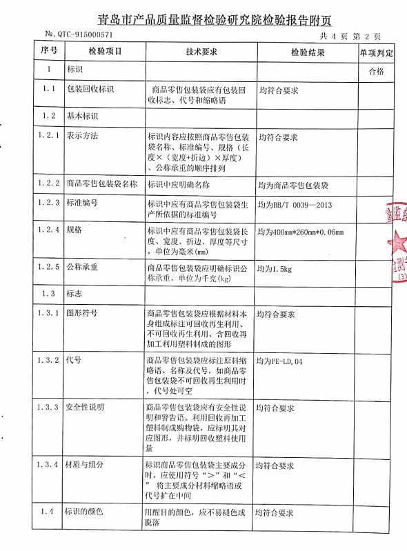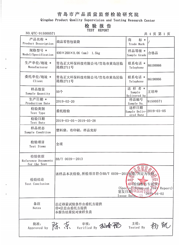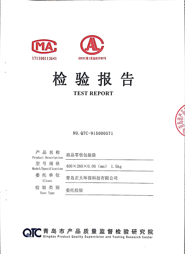青島正大環保生產的零售商品包裝袋400*260*0.06mm順利通過青島質量監督檢查院檢測